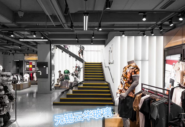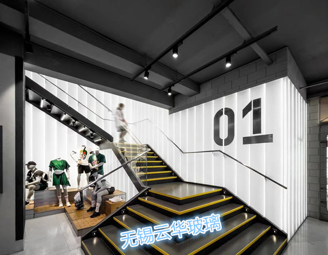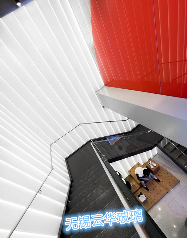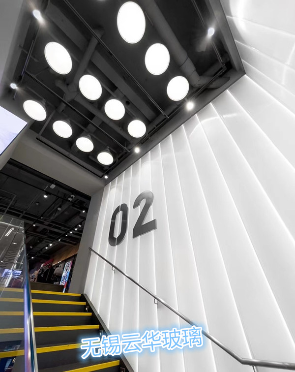 選用無錫云華超白細條紋噴砂U型玻璃,多種異形裁切。